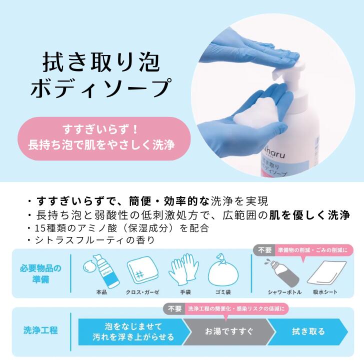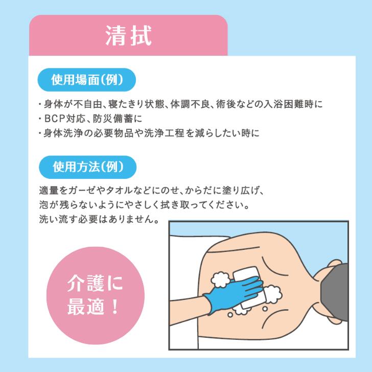 すすぎ0(ゼロ)で簡単・時短洗浄。泡を塗り広げて拭きとるだけ。フルーティな香りで広範囲の肌をやさしく洗浄。